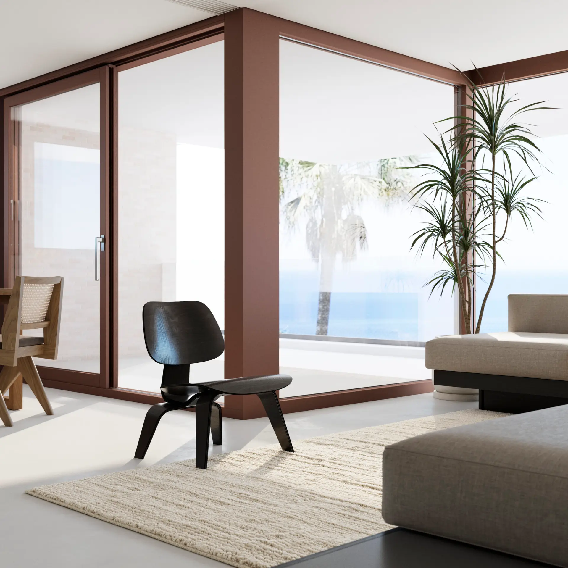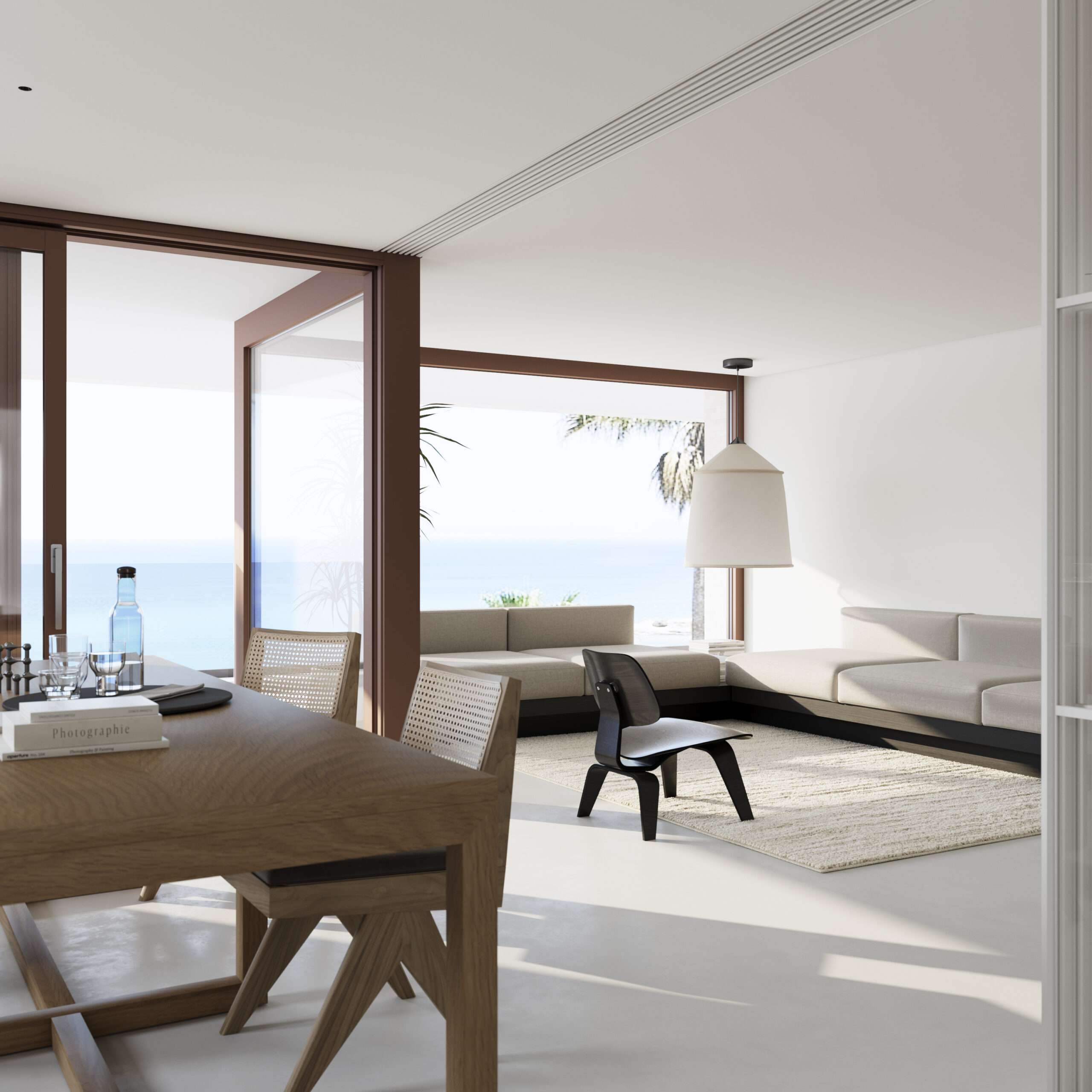 Grandes puertas correderas enmarcan las espectaculares vistas al mar, permitiendo que la luz natural inunde toda la estancia y potenciando la sensación de serenidad.